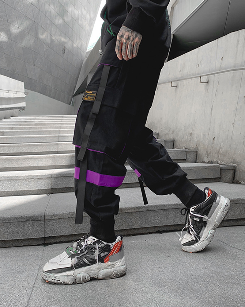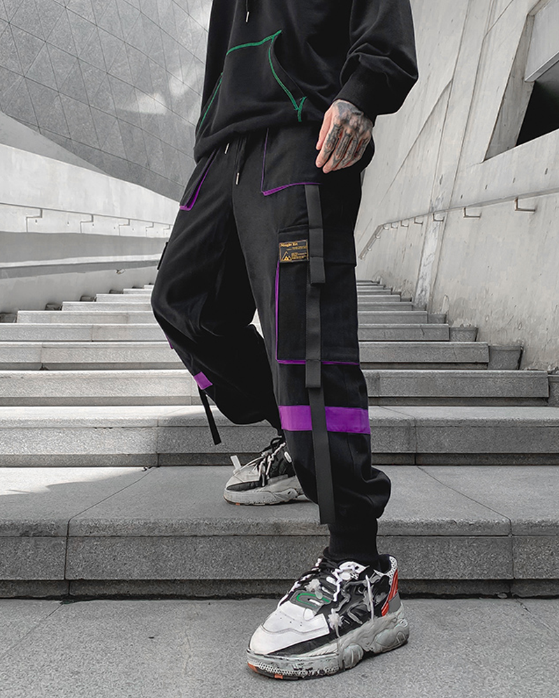 Add a touch of Japanese streetwear to your outfits with our Black And Purple Cargo Pants.