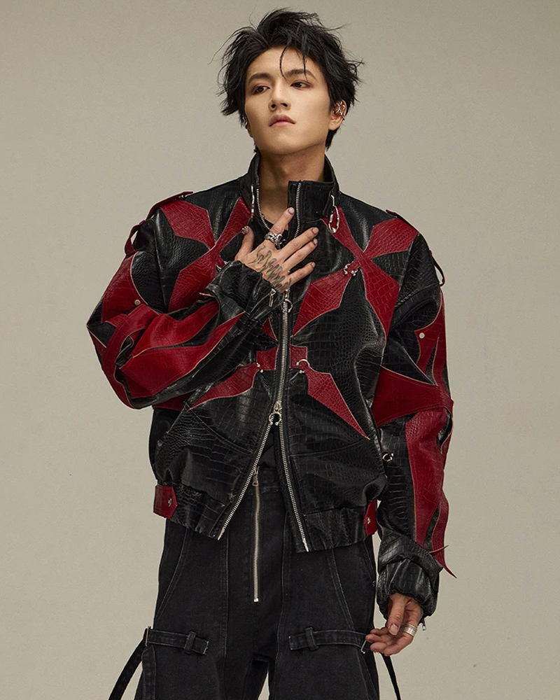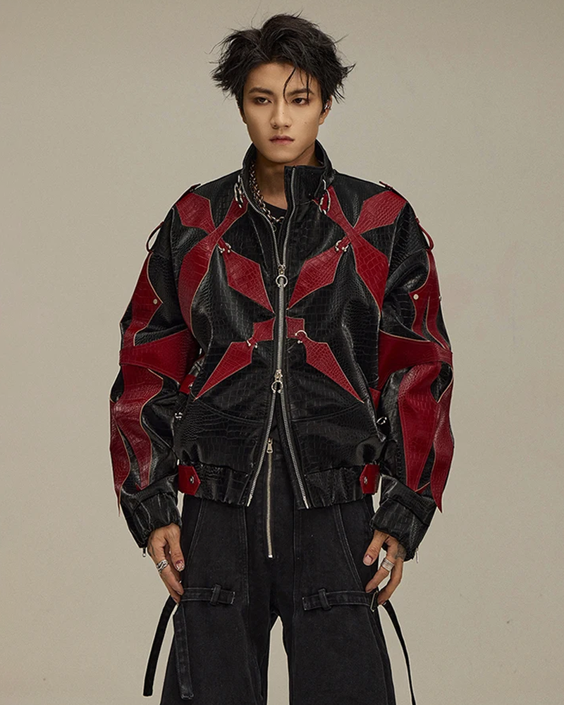 Our Black And Red Leather Jacket, made from quality materials, features red crosses all over the jacket, 2 front pockets, a high collar, and is available in 4 sizes.