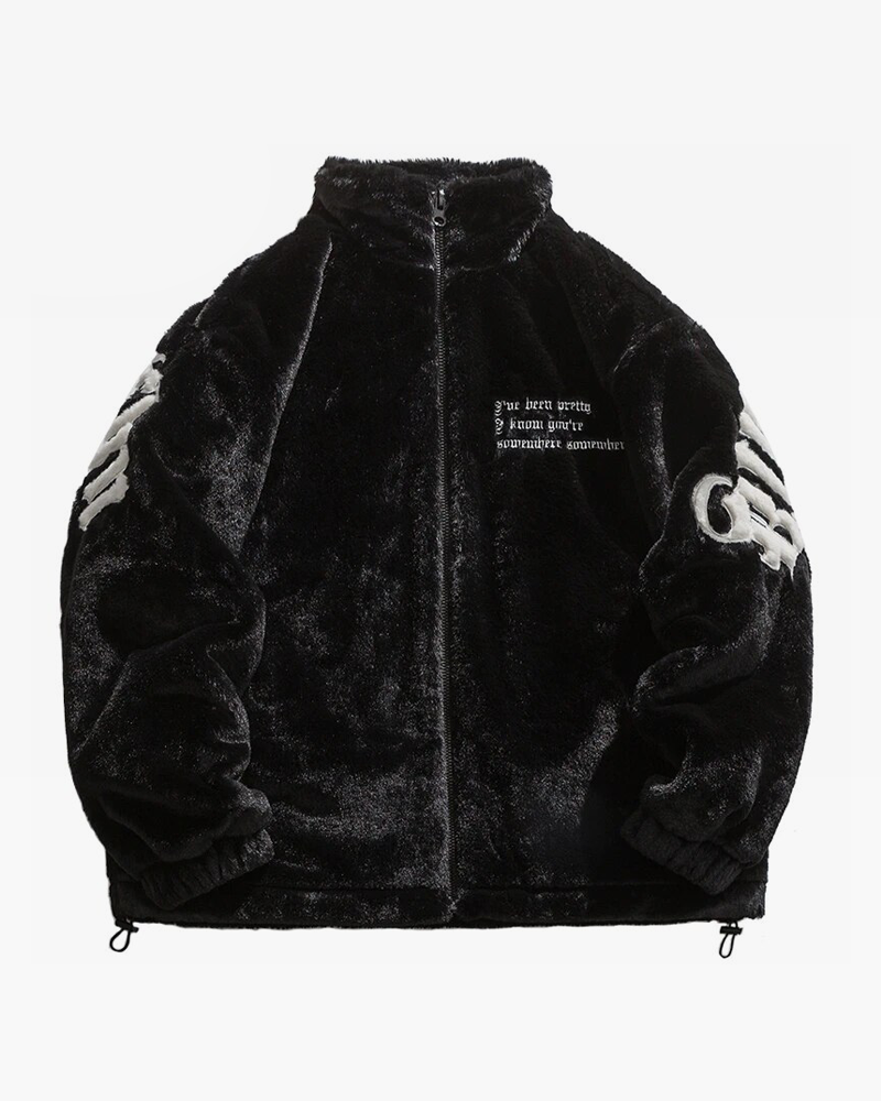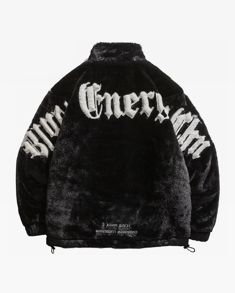 Our Black Faux Fur Jacket, made from quality materials, features a text logo in faux fur on the back and sleeves and will keep you warm this winter. Shop now!