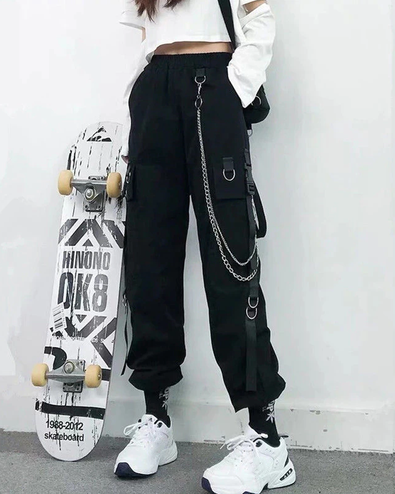 Opt for a powerful streetwear style with our Cargo Pants With Chain.