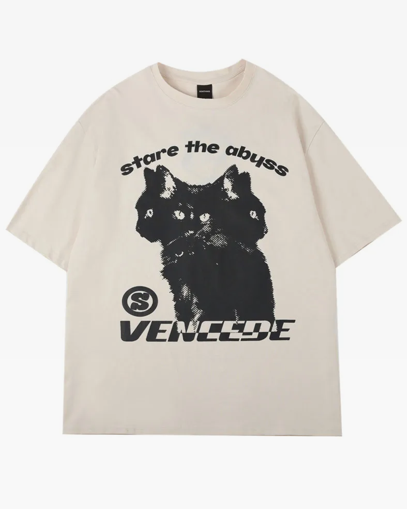 Our Cat Graphic Shirt, made from quality materials, features an artistic cat print and the slogan "stare the abyss" on the front. Get yours today!