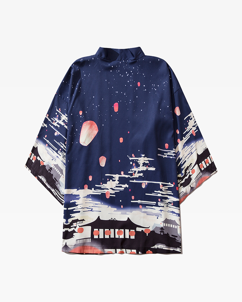 Dark Blue Kimono Jacket representing Japanese paper lanterns on a starry sky.