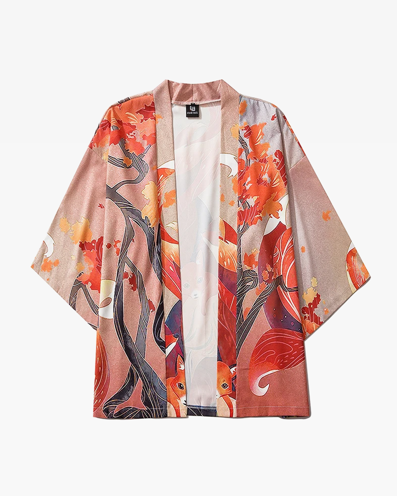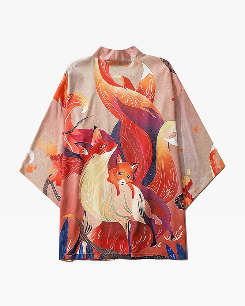 This Japanese kimono represents beautiful foxes in shades of red, orange and yellow.
