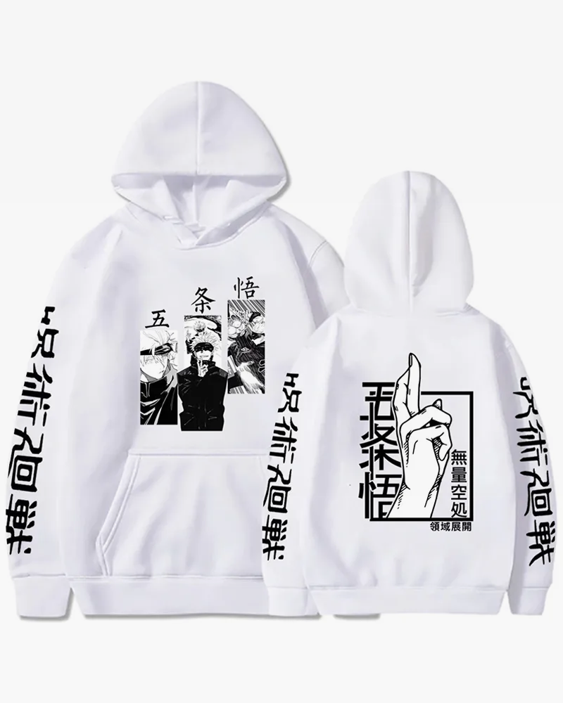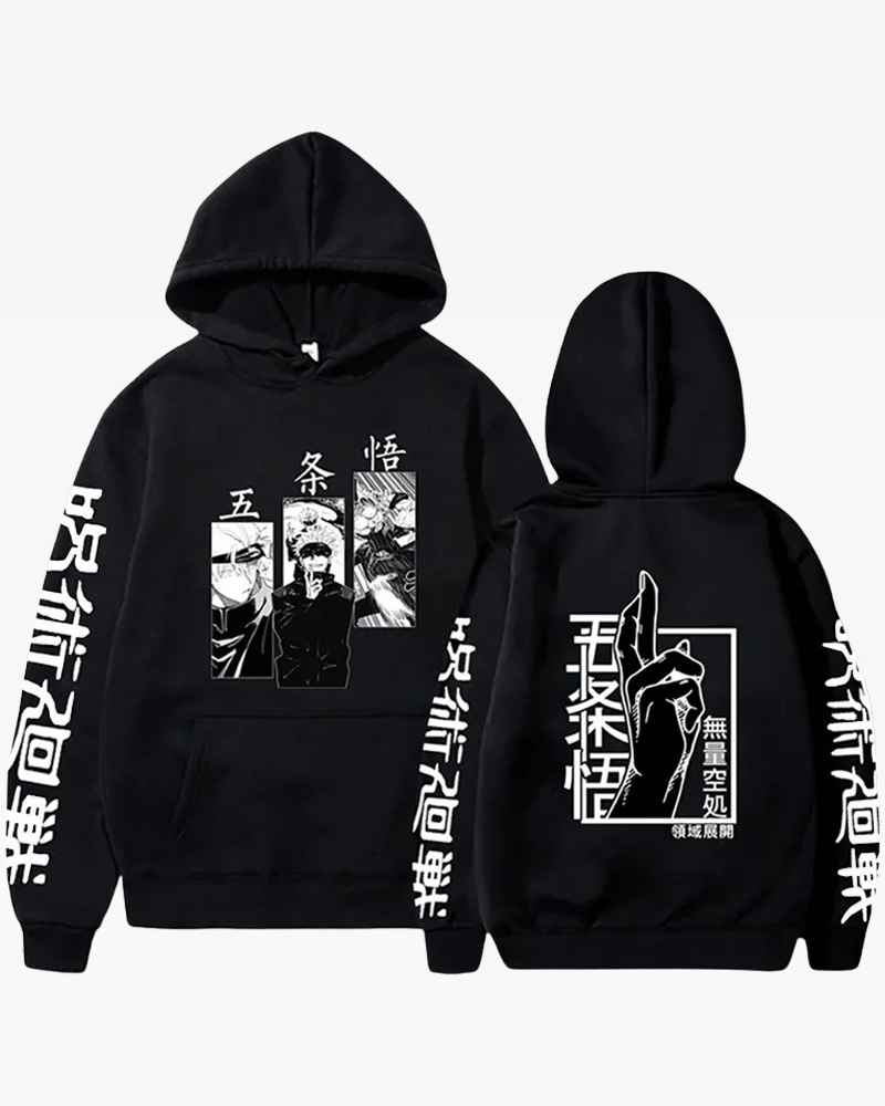 Our Gojo Satoru Hoodie, made from quality material, features a Gojo Satoru print on front, a Domain Expansion technique print on back and is available in 3 colors.