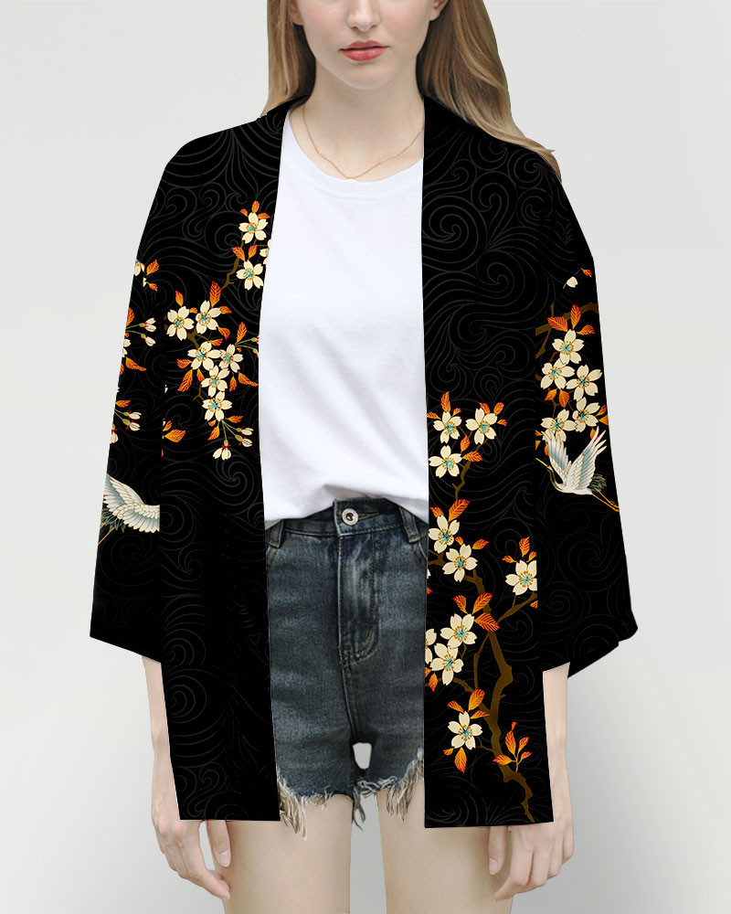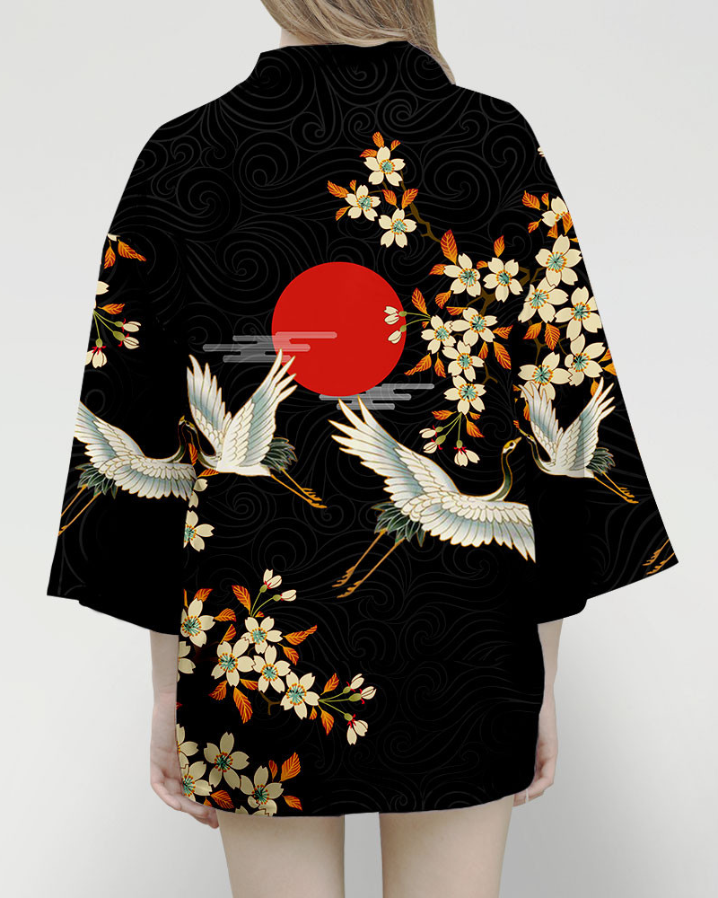 This Japanese Kimono Jacket representing Japanese cranes on a sunset background will go perfectly with your usual clothes.