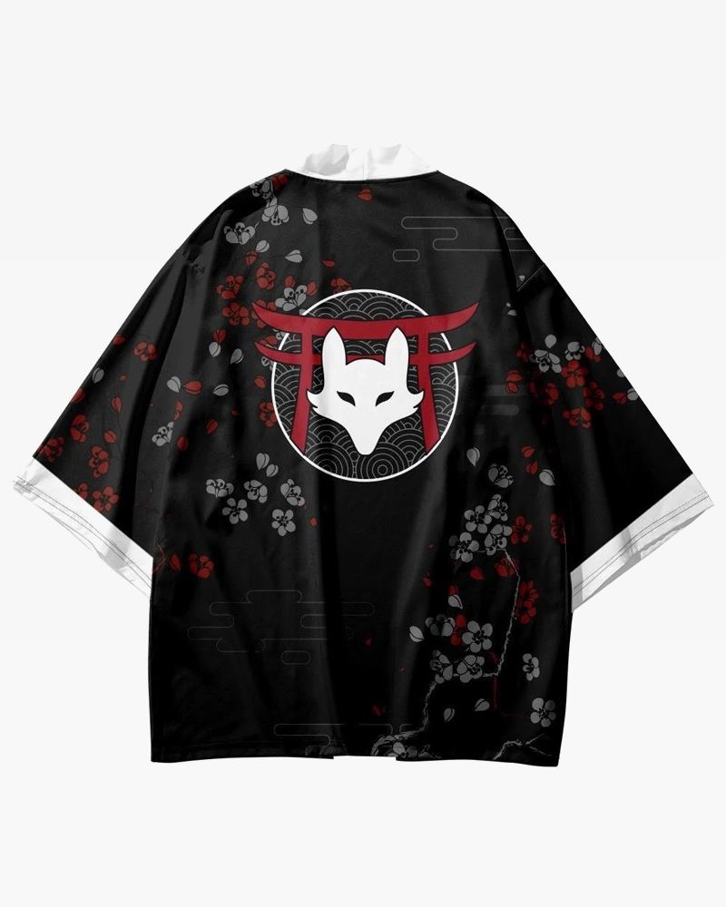 Sober black kimono representing a kitsune and many symbols of Japanese culture.