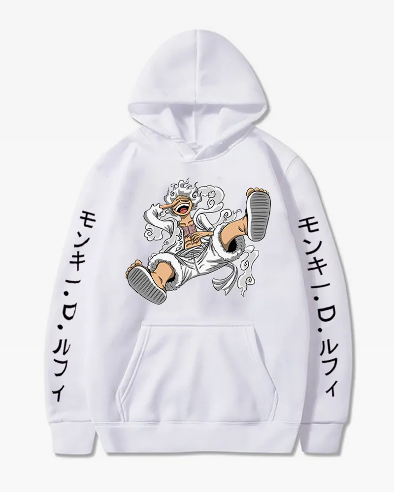 Our Luffy Gear 5 Hoodie, made from quality material, features a Gear 5 Luffy print on the front, printed kanjis on the sleeves and is available in 5 colors.
