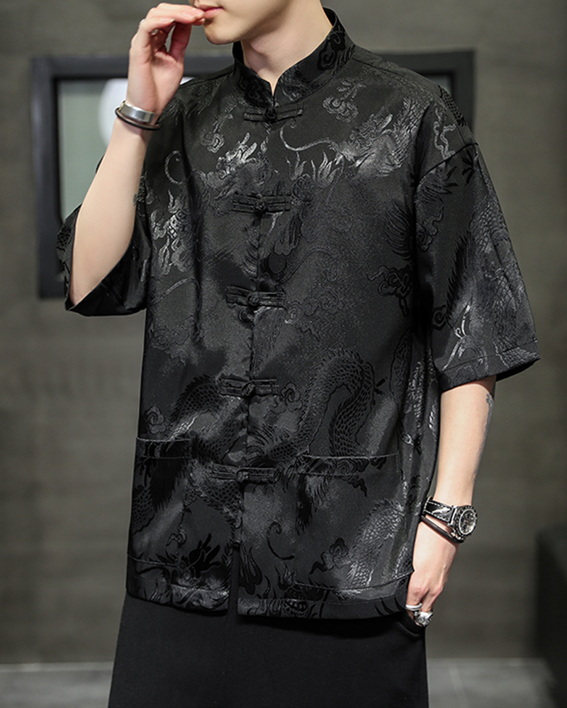 Add a touch of Japanese culture to your outfit with this Mens Black Kimono Jacket featuring dragon patterns.