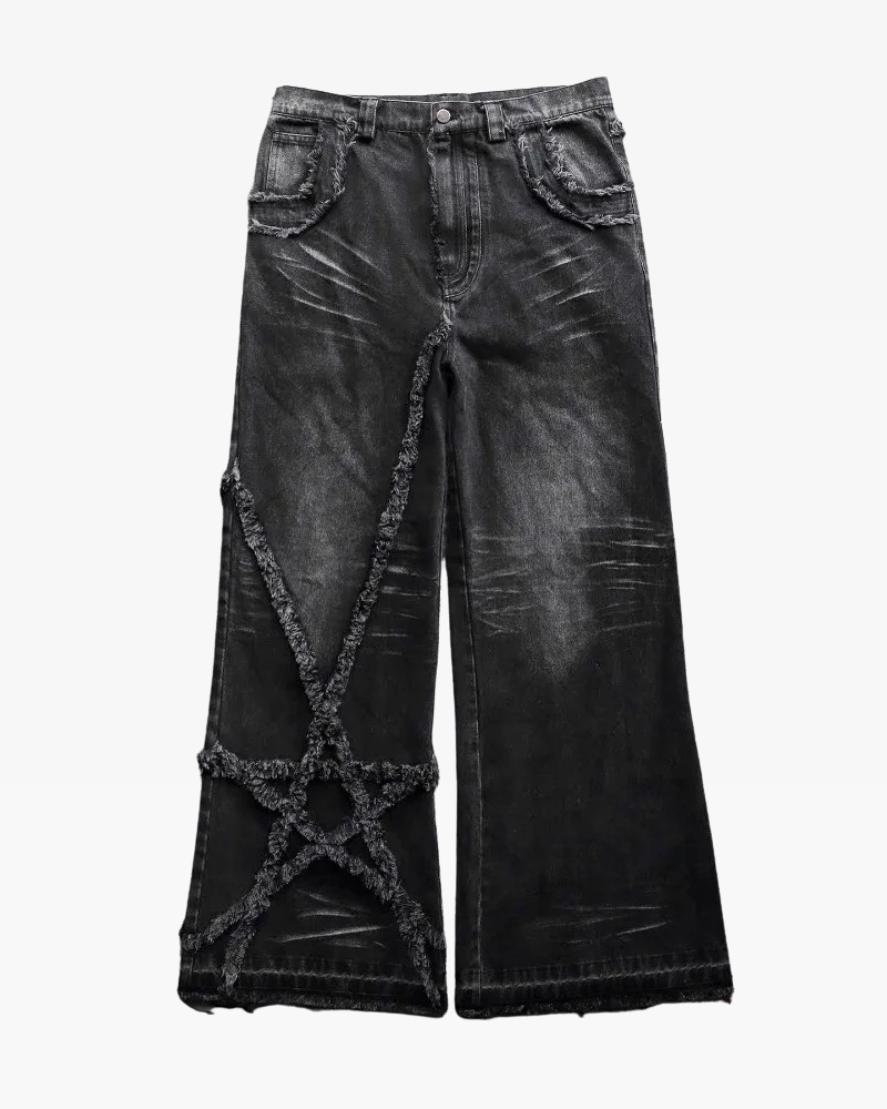 Our Pentagram Jeans, made from quality material, feature a pentagram on the right leg, a high-waist baggy fit and are available in 6 sizes. Get yours today!