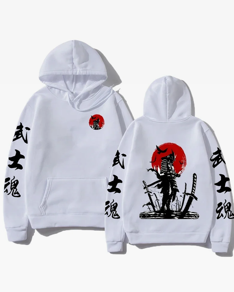 Our Samurai Hoodie, made from quality material, features a Japanese samurai print on front and back, printed kanjis on the sleeves and is available in 2 colors.