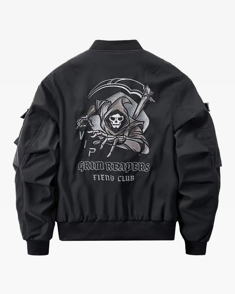 Our Techwear Bomber Jacket, made from quality materials, features a grim reaper embroidery. This jacket's techwear styling and dark reaper imagery make it a unique and powerful piece. Get yours today!