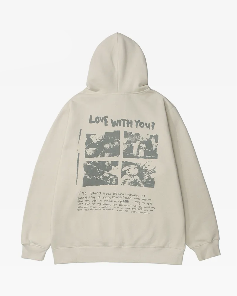 Our Teddy Bear Print Hoodie, made from quality materials, features a "Love With You?" text print and a graphic Teddy Bear thumbnail print. Shop now!