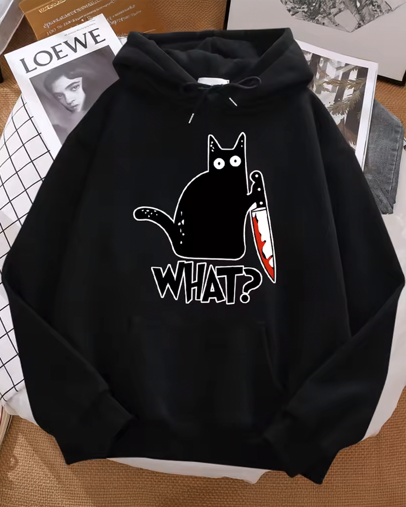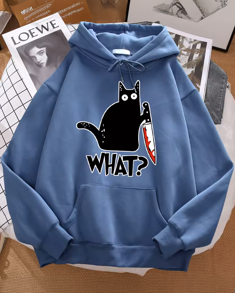 Our What Cat Hoodie, made from quality material, features a cat with a knife on the front, a hood with drawstring and is available in 5 colors.