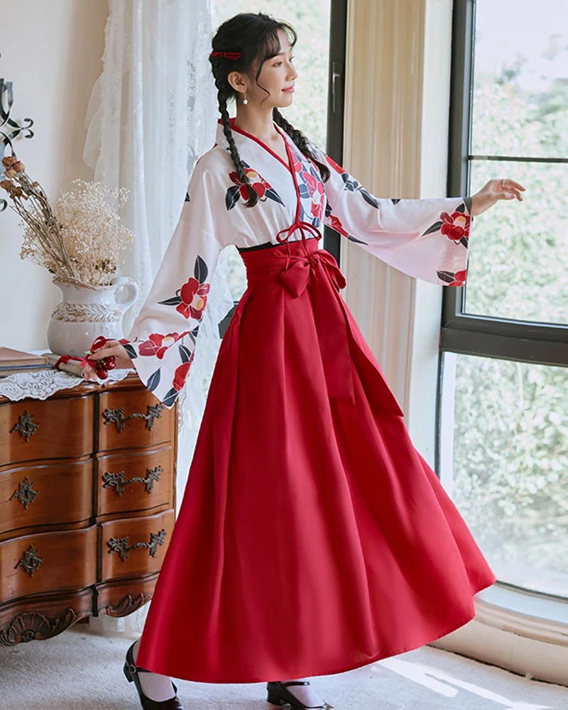 Dress up like a real Japanese girl with this Womens Floral Kimono and skirt set.