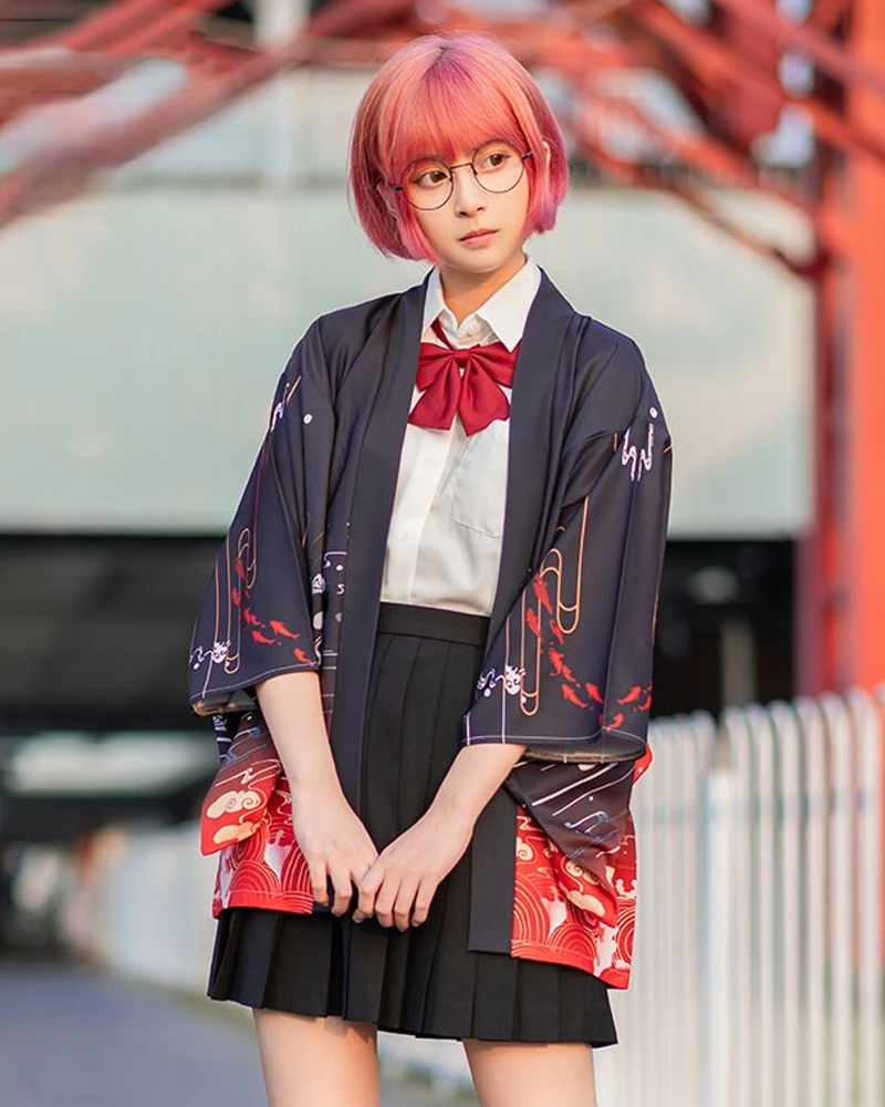 This black and red Womens Kimono Jacket represents a Japanese koi carp in a traditional artistic style.